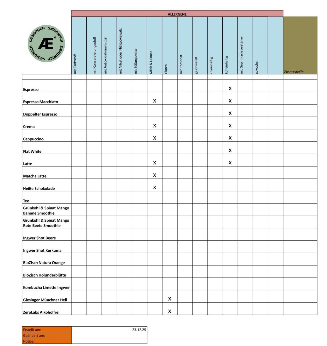 ° Vollständige Information: Die nachfolgende Tabelle enthält 14 Hauptallergene gemäß der Lebensmittelinformationsverordnung (LMIV) sowie die Zusatzstoffe, die in unseren Produkten enthalten sind.