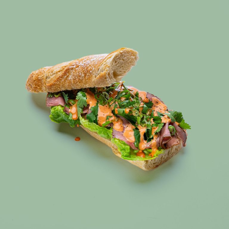 Der unvergessliche asiatische Genuss: Zartes Roastbeef auf Weizenbrot, verfeinert mit frischem Koriander und Frühlingszwiebeln.