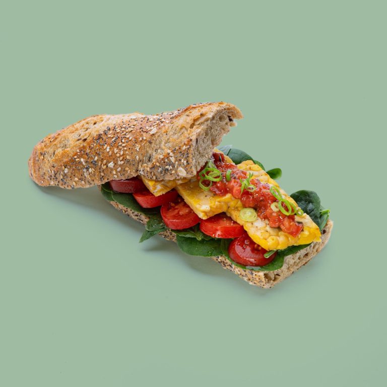 Protein-Power auf Vollkorn: Nahrhaftes Tempeh auf Vollkornbrot mit knackigem Blattspinat und frischen Tomaten.