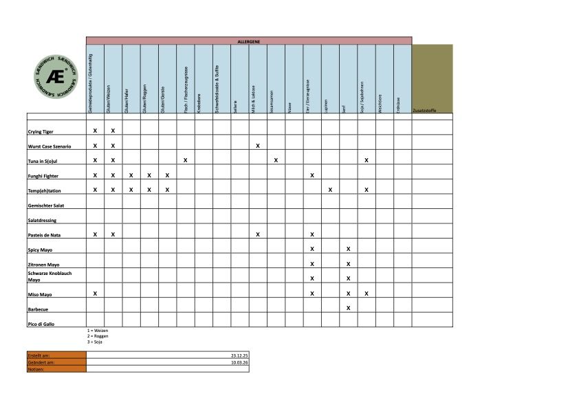 ° Kreuzkontamination: Da alle unsere SÆndwich-Kreationen und Gebäckstücke in einer zentralen Küche zubereitet werden, können wir trotz größter Sorgfalt das Vorhandensein von Spuren anderer Allergene in keinem Produkt gänzlich ausschließen. Dies betrifft insbesondere Gluten, Nüsse und Schalenfrüchte.
